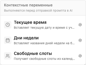 Контекстные переменные — это динамические данные, которые автоматически подставляются в промпт при каждом сообщении. Три переменные: текущее время (current_time), день недели (page_day) и свободные слоты (free_slots). Они делают промпт «живым» — бот знает который час, какой день и когда есть свободное время.