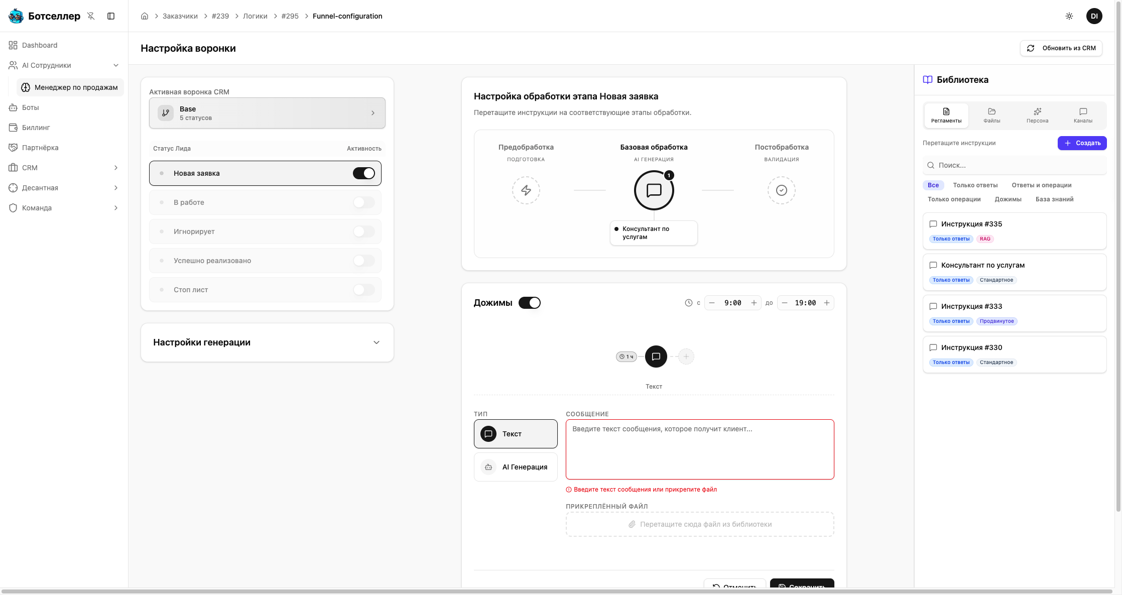 - AI Генерация — перетащите инструкцию типа «Для Дожимов» из библиотеки