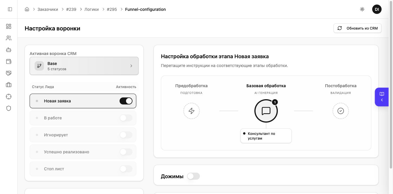 На странице «Настройка воронки» выберите нужный этап (например, «Новая заявка»). В настройках этапа активируйте переключатель «Дожимы».