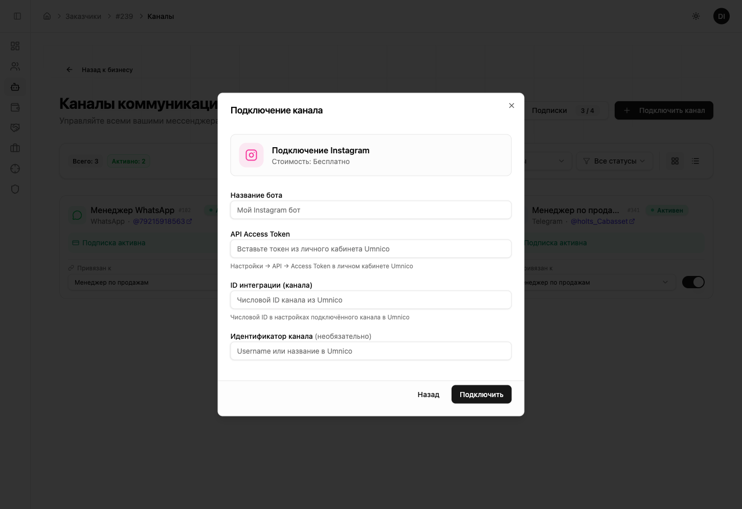 Подключение Instagram в Botseller бесплатное — за канал не взимается абонентская плата. Umnico предоставляет бесплатный тариф для одного канала. Если вам нужно подключить несколько каналов через Umnico — может потребоваться платный тариф на стороне Umnico. Актуальные цены на все каналы можно посмотреть в разделе тарифов.