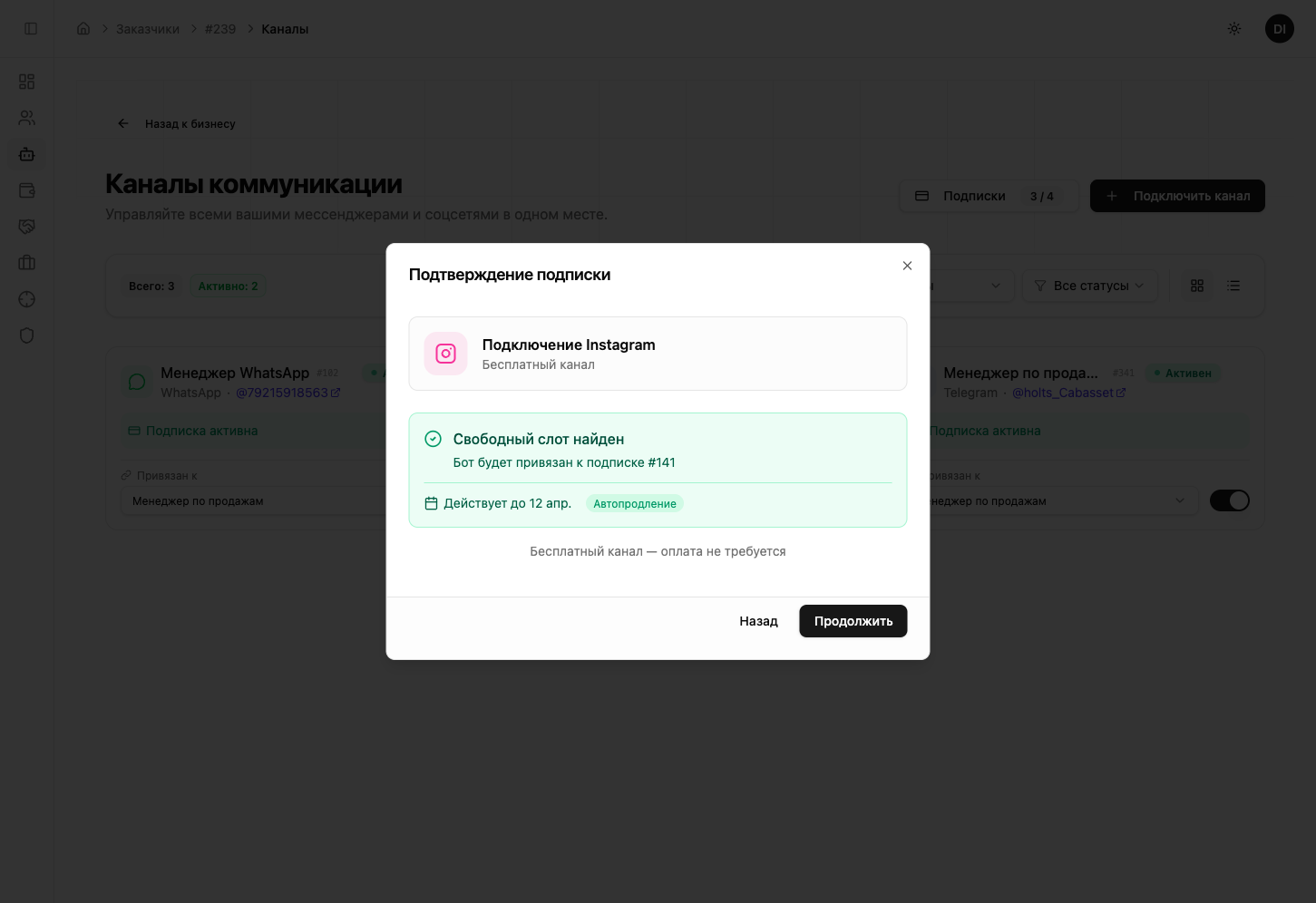 В диалоге выбора канала выберите «Instagram». Система автоматически создаст бесплатную подписку — нажмите «Активировать».