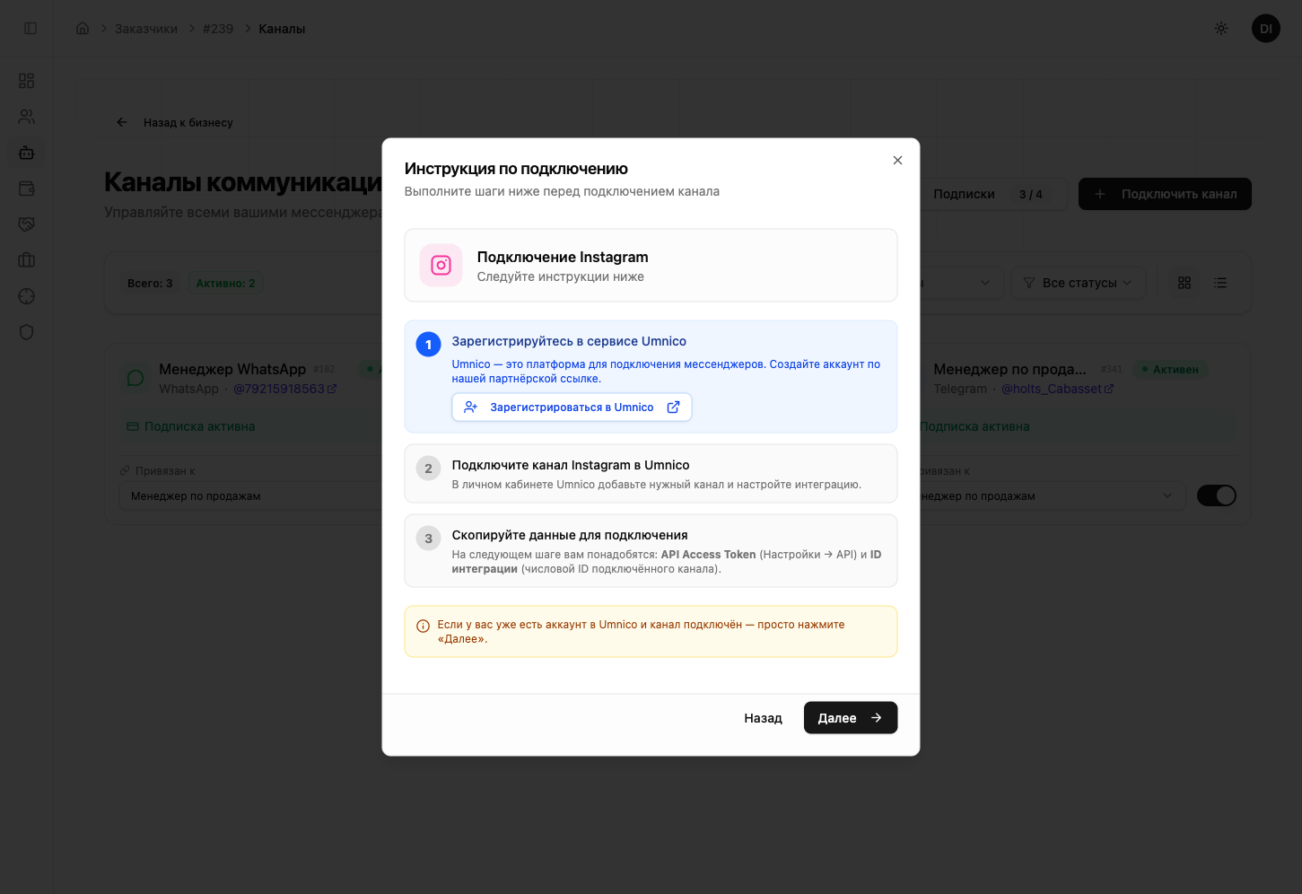 После активации вы увидите инструкцию по подключению через Umnico.