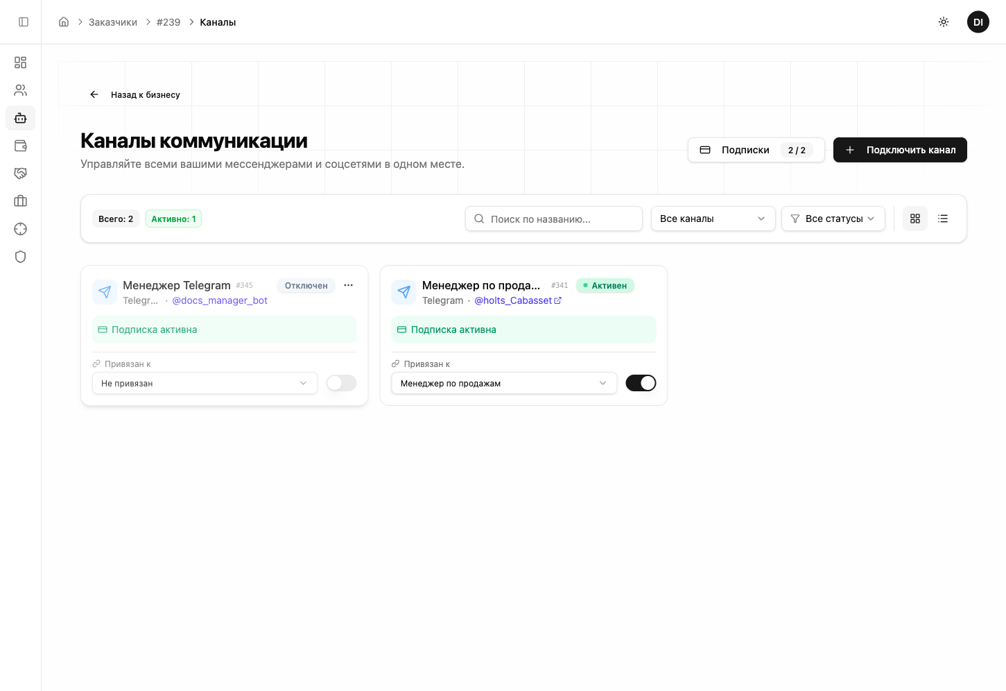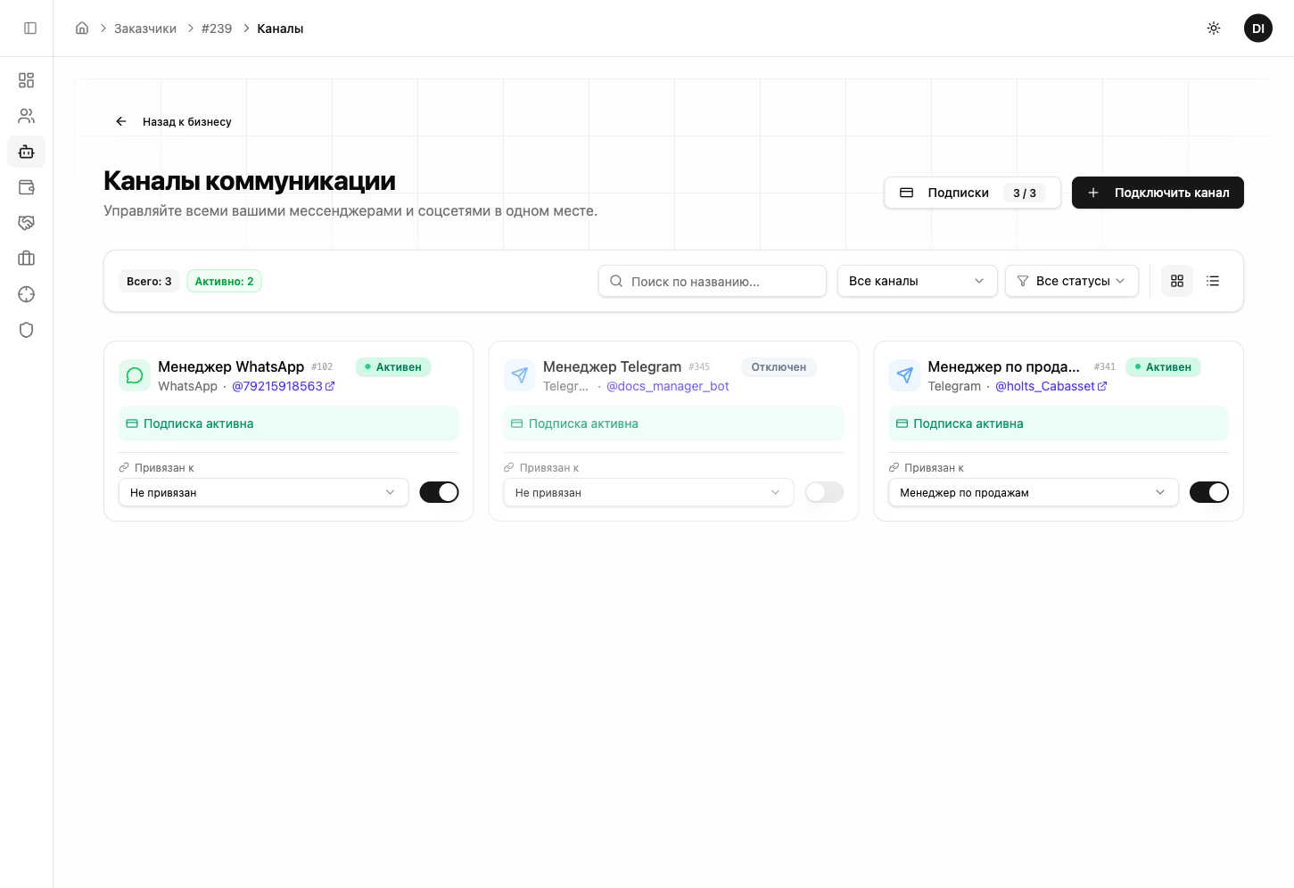 Да. Каждый номер — это отдельный канал со своей подпиской. Все каналы управляются из единой панели. Каждый канал можно привязать к разным ИИ-сотрудникам.