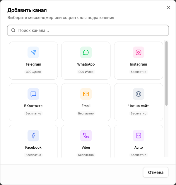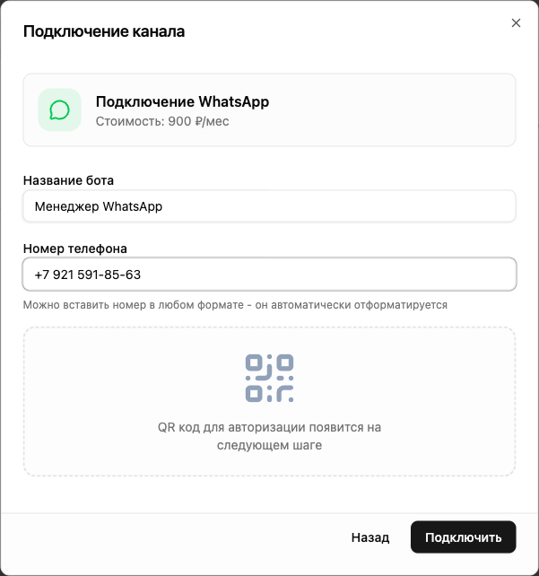 Стоимость подписки на WhatsApp-канал указана на странице подключения в разделе «Боты и каналы». Подписка списывается с баланса аккаунта и автопродлевается каждые 30 дней. Актуальные цены на все каналы можно посмотреть в разделе тарифов.
