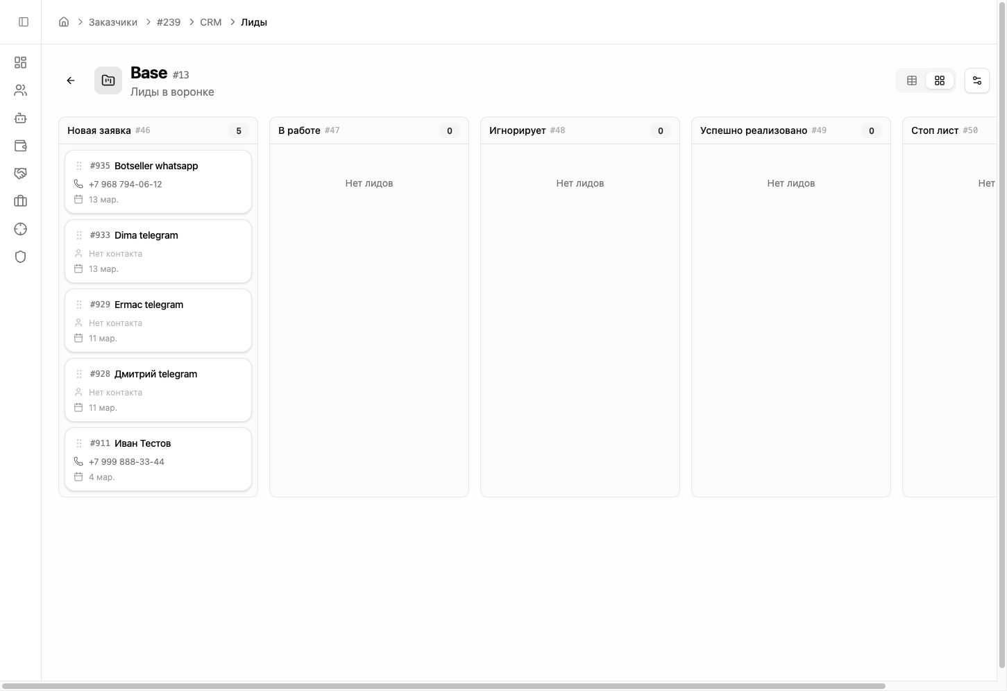 При первом сообщении от клиента система автоматически создаёт лид в воронке продаж. На Kanban-доске лид отображается в колонке «Новая заявка» с контактными данными.