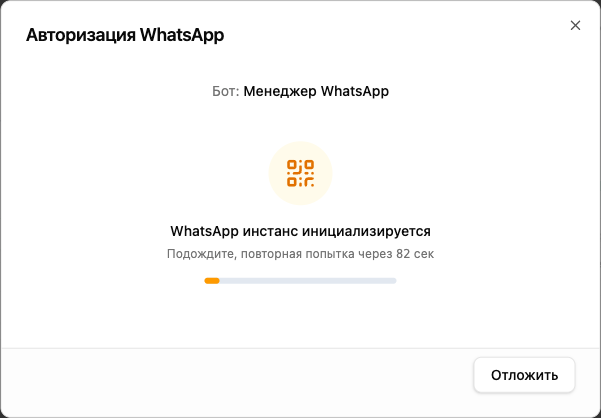 Инициализация WhatsApp-инстанса занимает до 2 минут. На экране отображается таймер обратного отсчёта. Подождите — QR-код появится автоматически. Если код не появился: