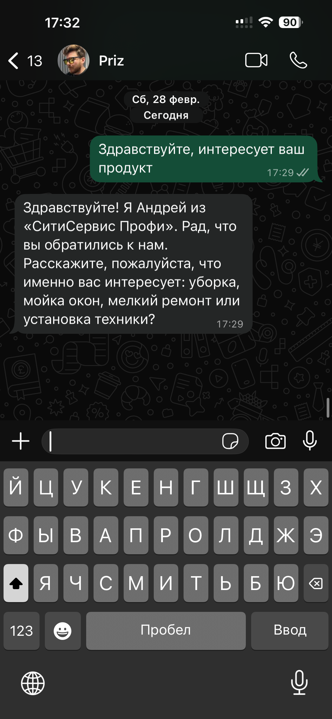 Двусторонняя связь: менеджер может в любой момент написать клиенту из CRM — сообщение уйдёт в WhatsApp. Бот автоматически приостанавливается, пока менеджер ведёт диалог.