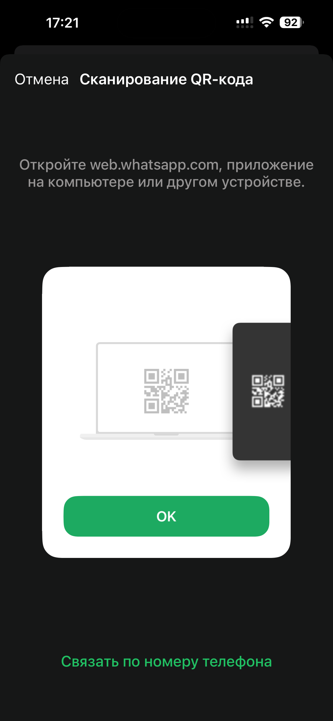 - Телефон с WhatsApp — на номере, который хотите подключить