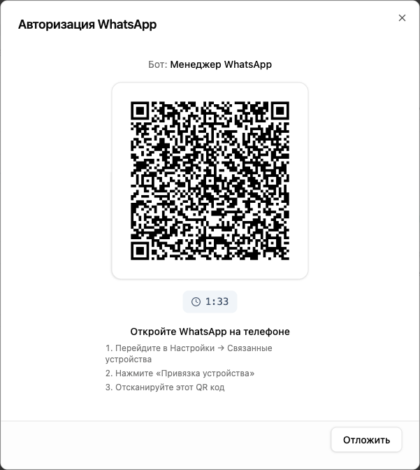QR-код действует ~2 минуты. Если не успели — система автоматически сгенерирует новый. Если QR не появился — закройте диалог и нажмите «Авторизовать WhatsApp» на карточке бота.