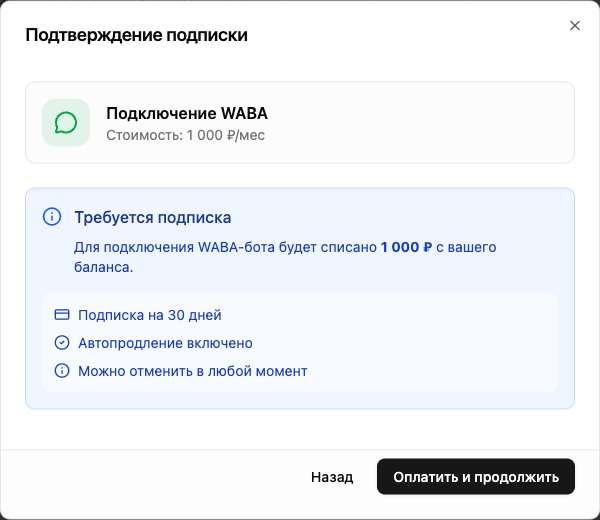 В диалоге выбора канала выберите «WABA». Система предложит оформить подписку — нажмите «Оплатить и продолжить».