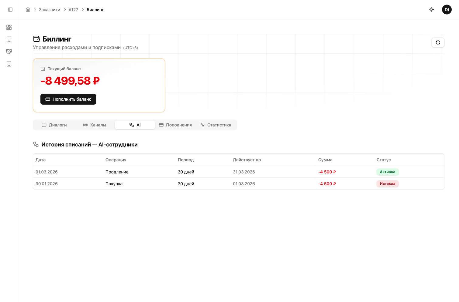 История подписок на ИИ-сотрудников — покупка, продление, суммы.