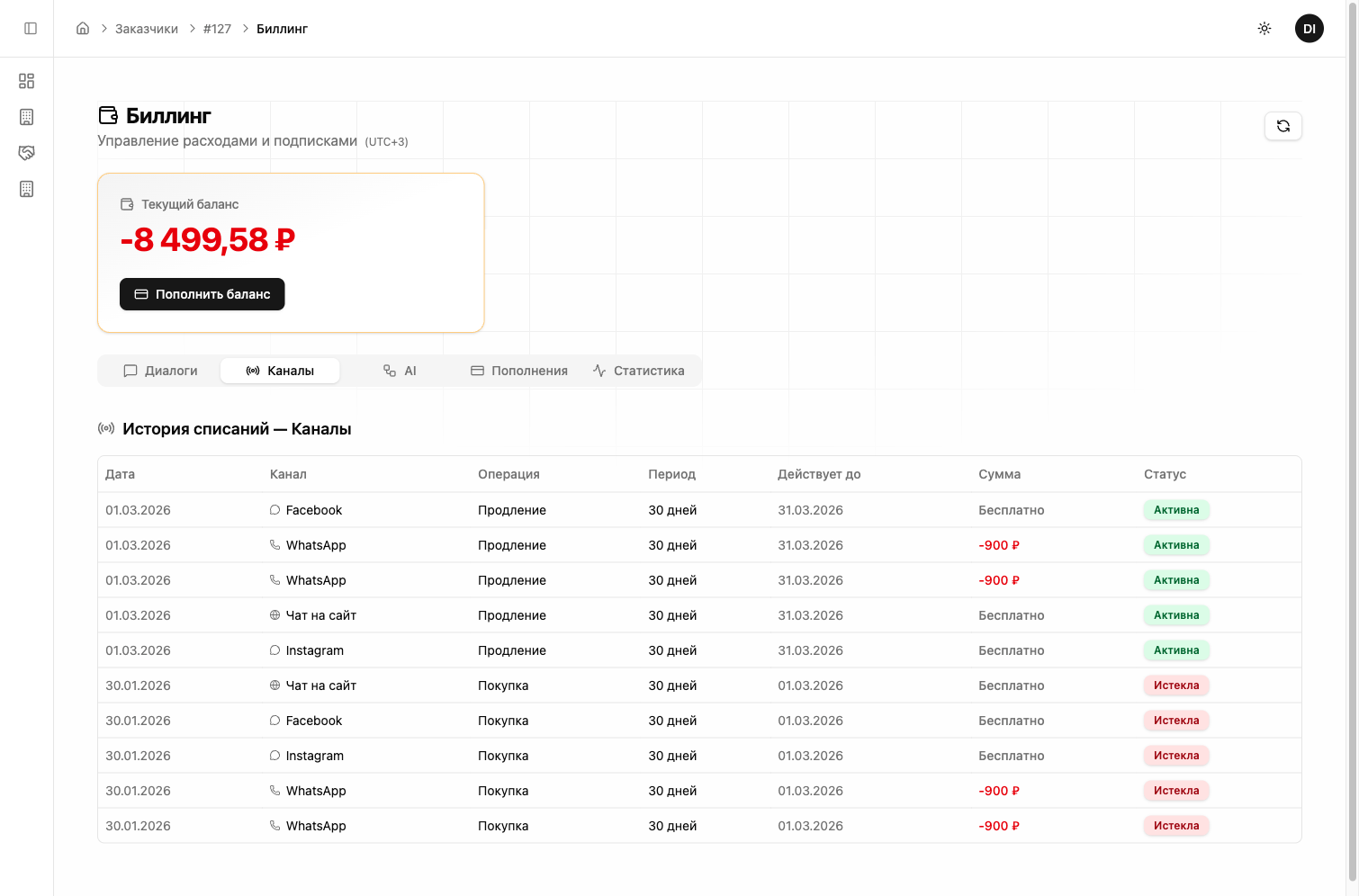 - Подключили канал (например, WhatsApp) — начинается ежемесячное списание