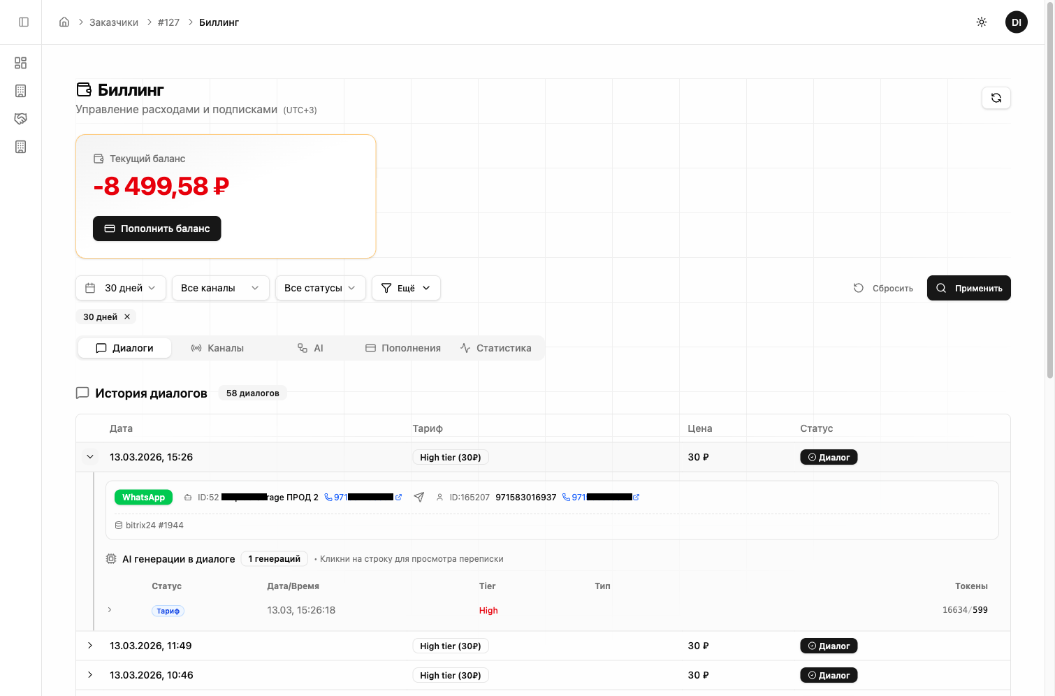 Да. На вкладке «Диалоги» нажмите стрелку рядом с нужным диалогом. Увидите: какой бот ответил, какой клиент написал, через какой мессенджер, ссылку на лид в CRM, количество AI-генераций и тир каждой транзакции.