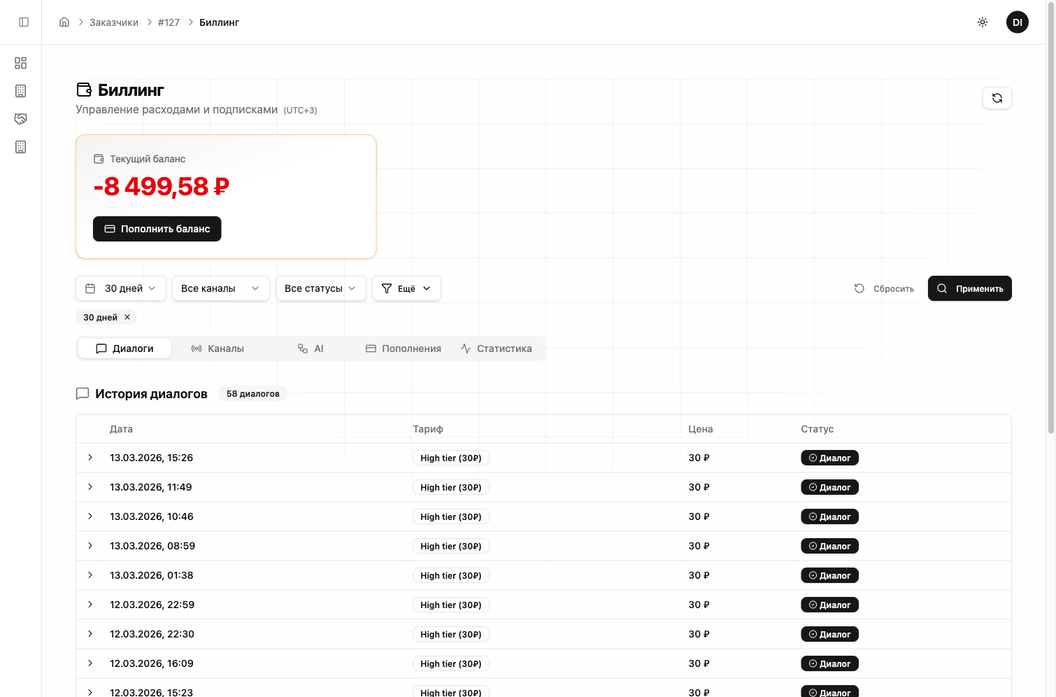 Botseller списывает средства за диалоги с клиентами, подписки на каналы и ИИ-сотрудников. Оплата прозрачная — вы видите каждый диалог, каждое списание, полную аналитику расходов. Ручные ответы менеджера и рассылки без нейросети — бесплатно.