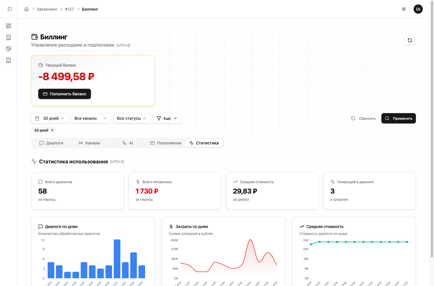 Откройте страницу «Биллинг» → вкладка «Статистика». Там видны расходы по дням, количество диалогов, средняя стоимость и графики динамики.