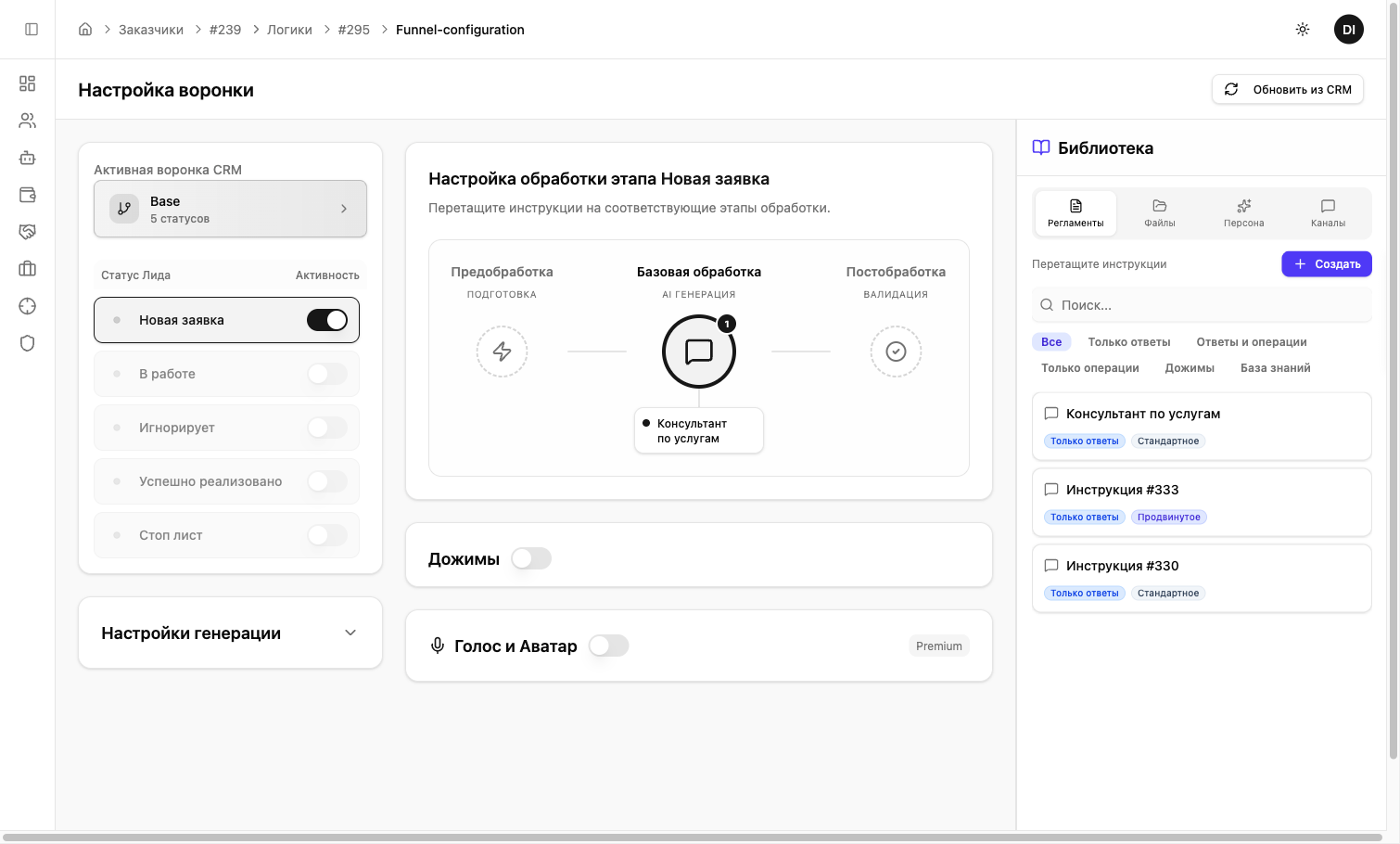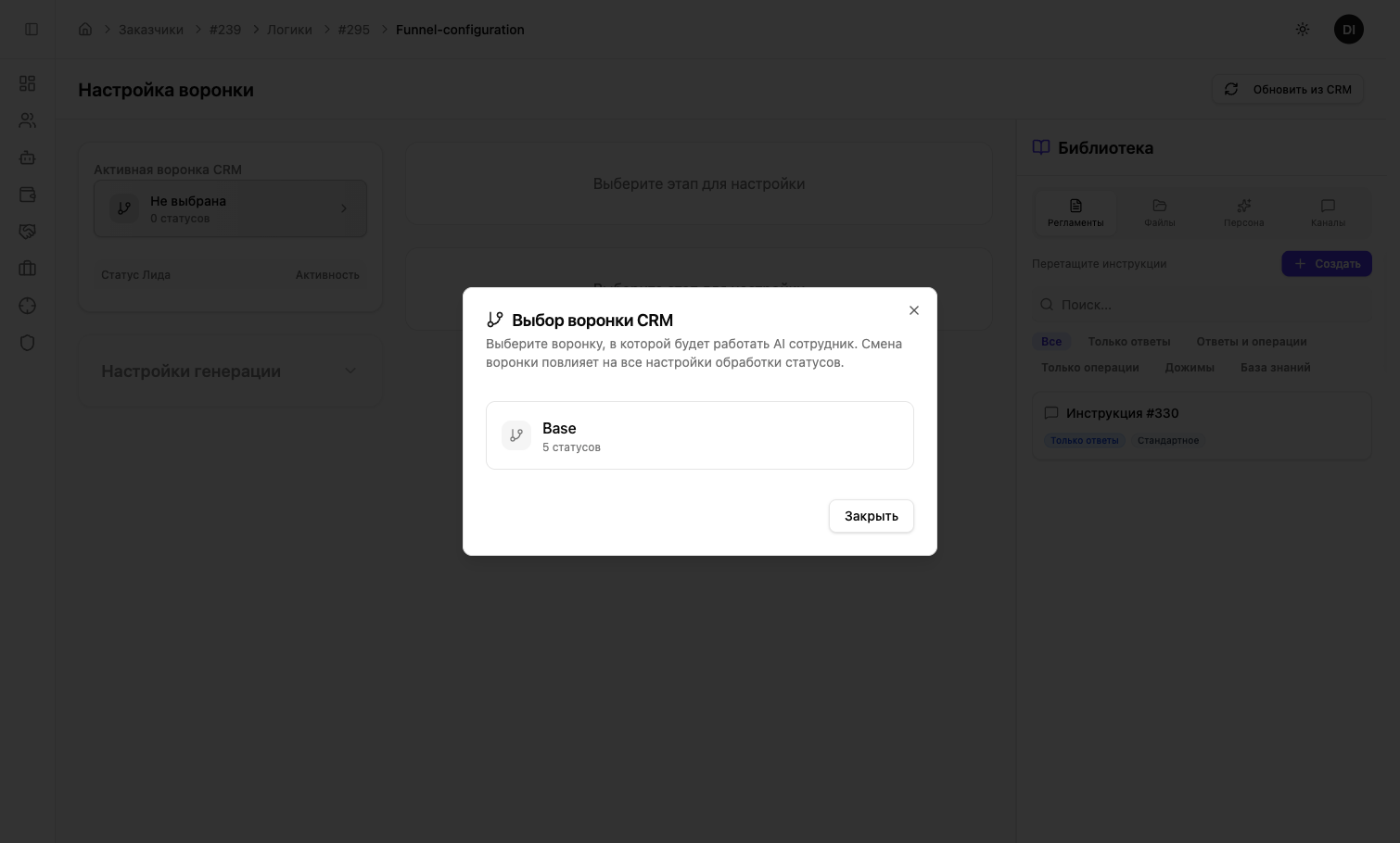 Нажмите на селектор «Активная воронка CRM» и выберите воронку. Если список пуст — нажмите «Обновить из CRM» в правом верхнем углу, чтобы синхронизировать данные.