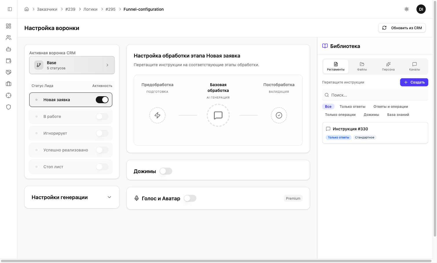 Без инструкции в «Базовой обработке» бот не будет генерировать ответы. Если бот не отвечает — первым делом проверьте, что инструкция назначена на нужный статус воронки.