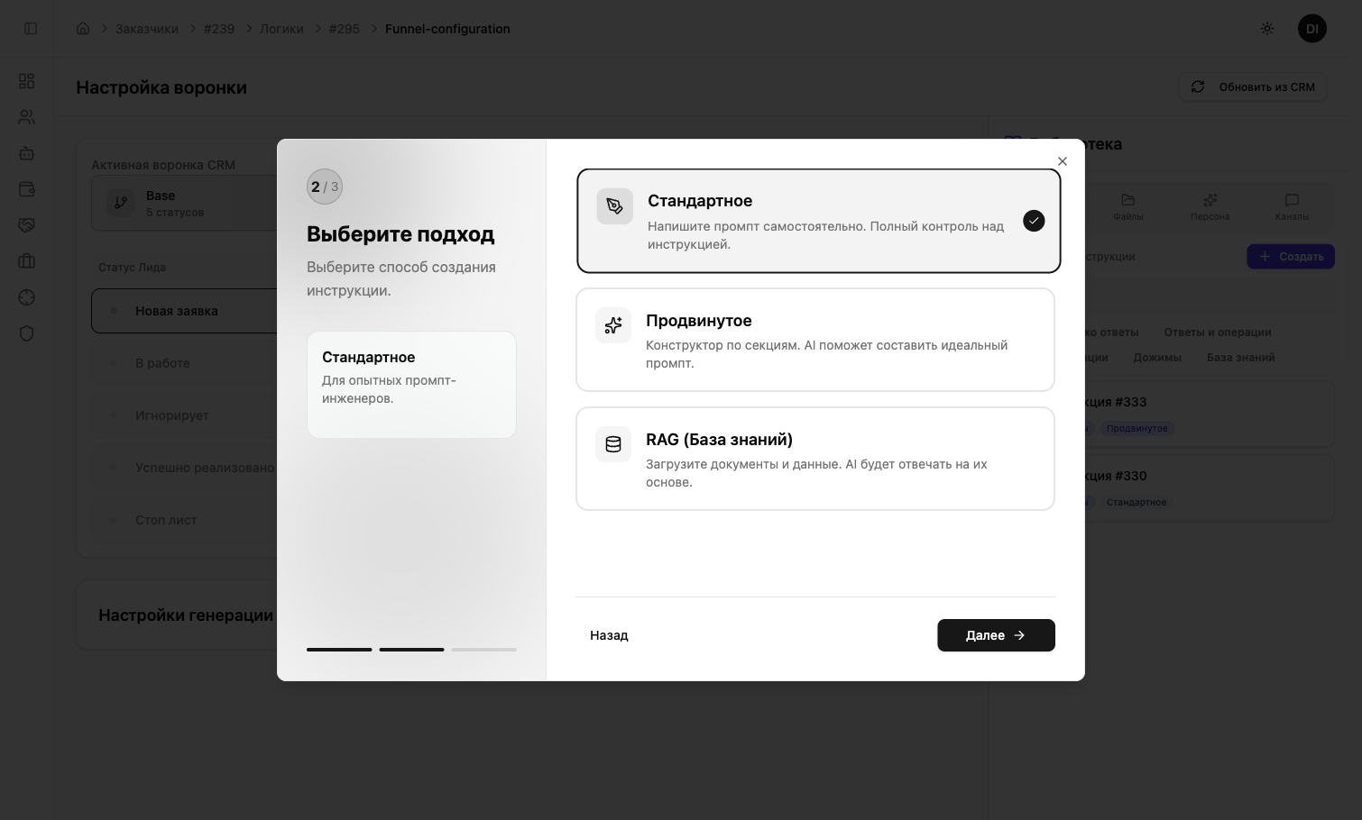 Выберите «Стандартное» — вы пишете промпт целиком в одном текстовом поле. Это самый простой и рекомендуемый подход.