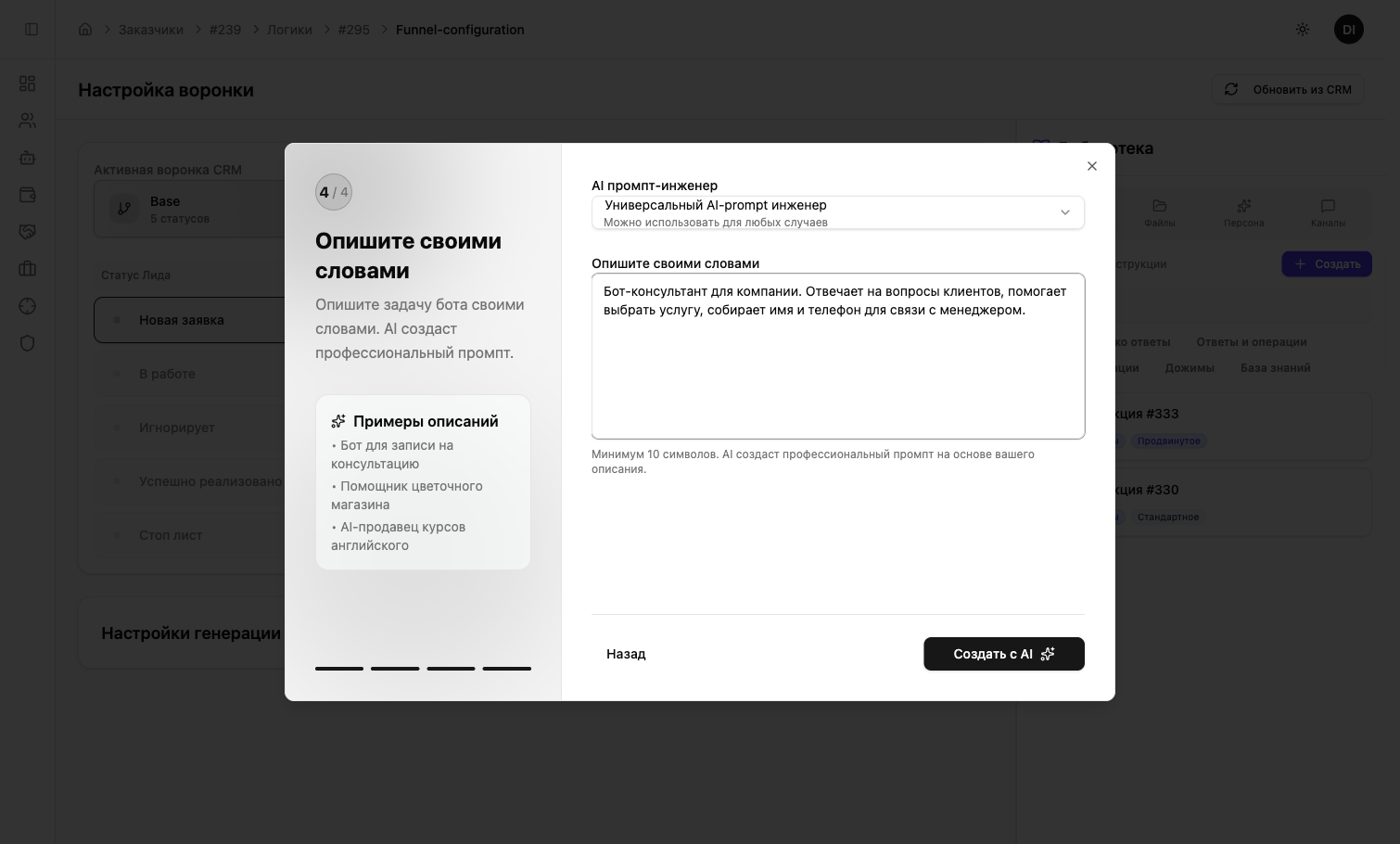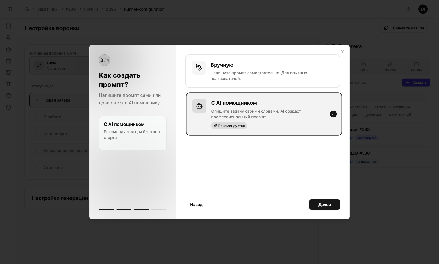 Выберите «С AI помощником» (рекомендуется) — AI сгенерирует готовый промпт на основе вашего описания бизнеса.