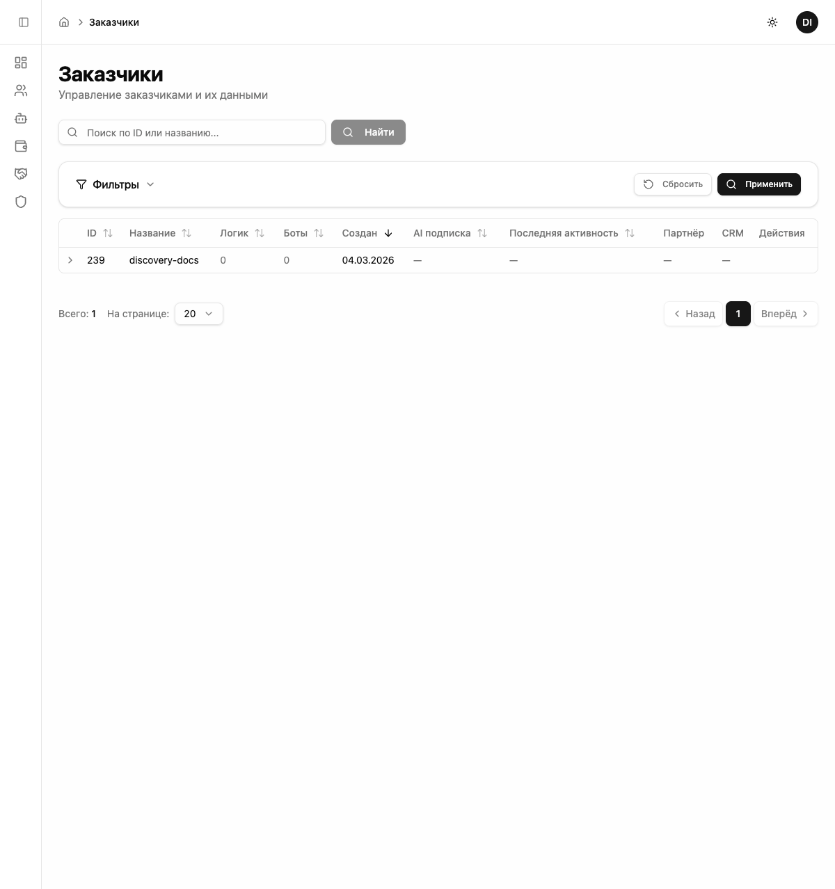 После входа вы попадёте в панель управления. Здесь видно ваш бизнес, количество ботов и логик.