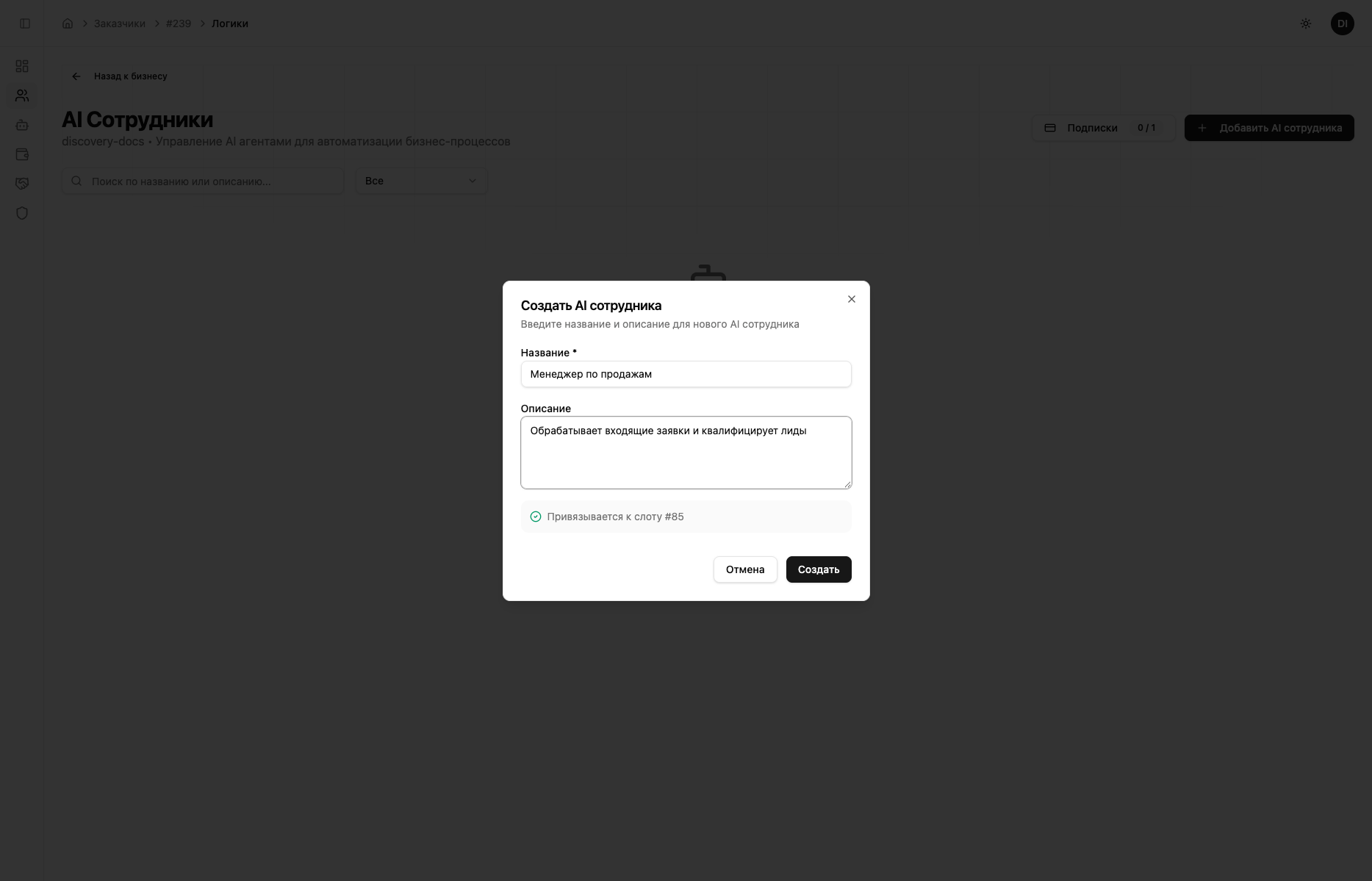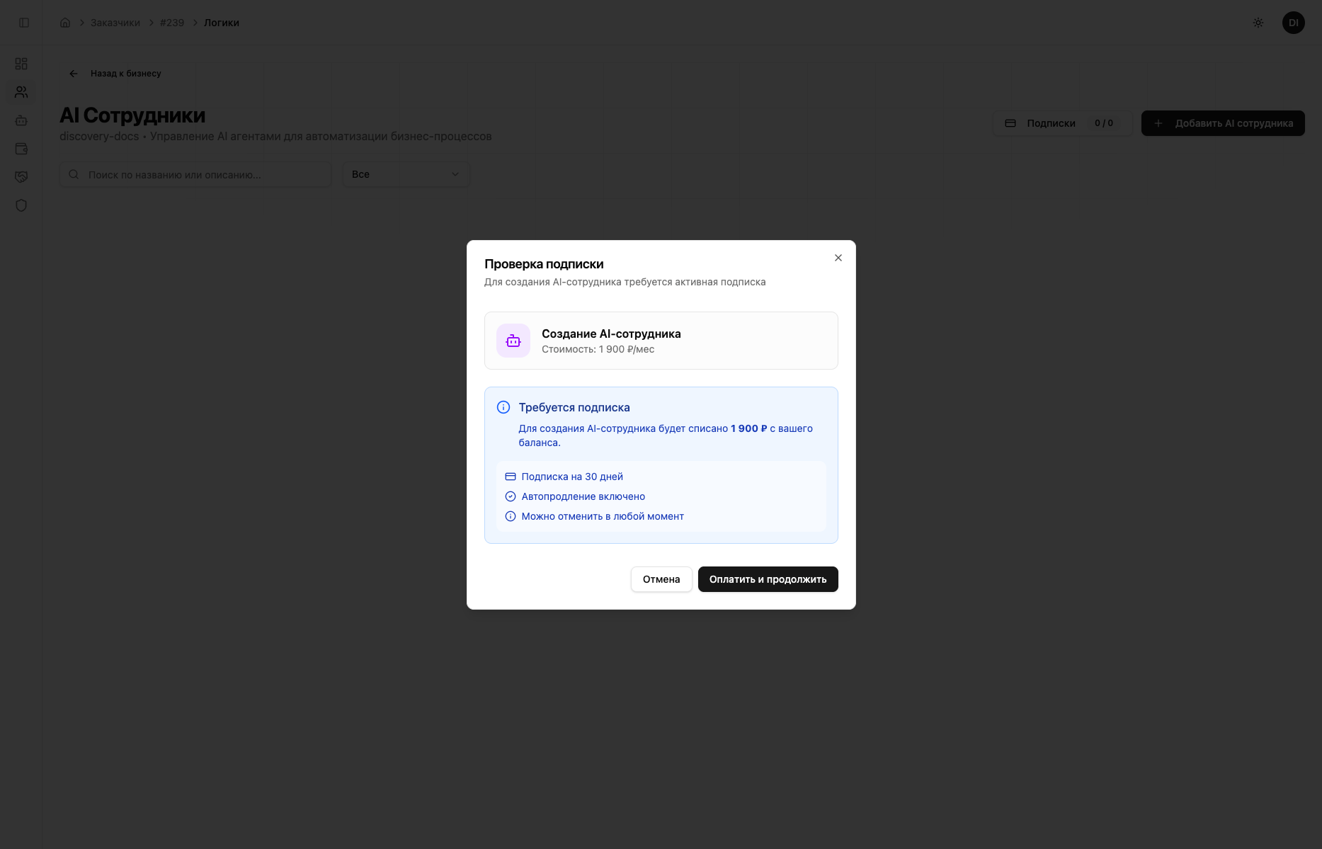 Сначала система предложит оформить подписку на слот ИИ-сотрудника. Стоимость списывается с баланса аккаунта, подписка автопродлевается каждые 30 дней. Актуальные цены — в разделе Тарифы и оплата.