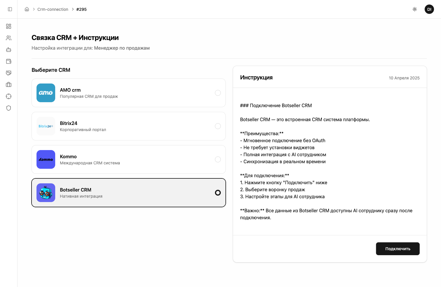 Botseller работает только в связке с CRM — все диалоги, лиды и данные клиентов хранятся в CRM-системе. Выберите Botseller CRM (встроенная, подключается мгновенно) и нажмите «Подключить».