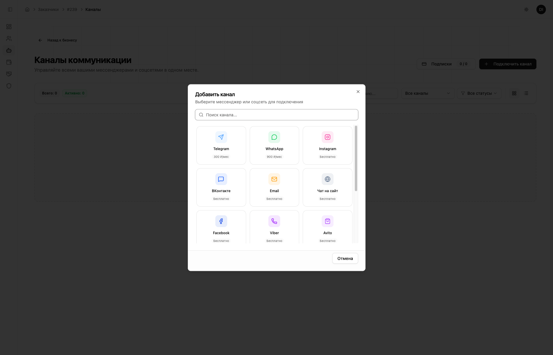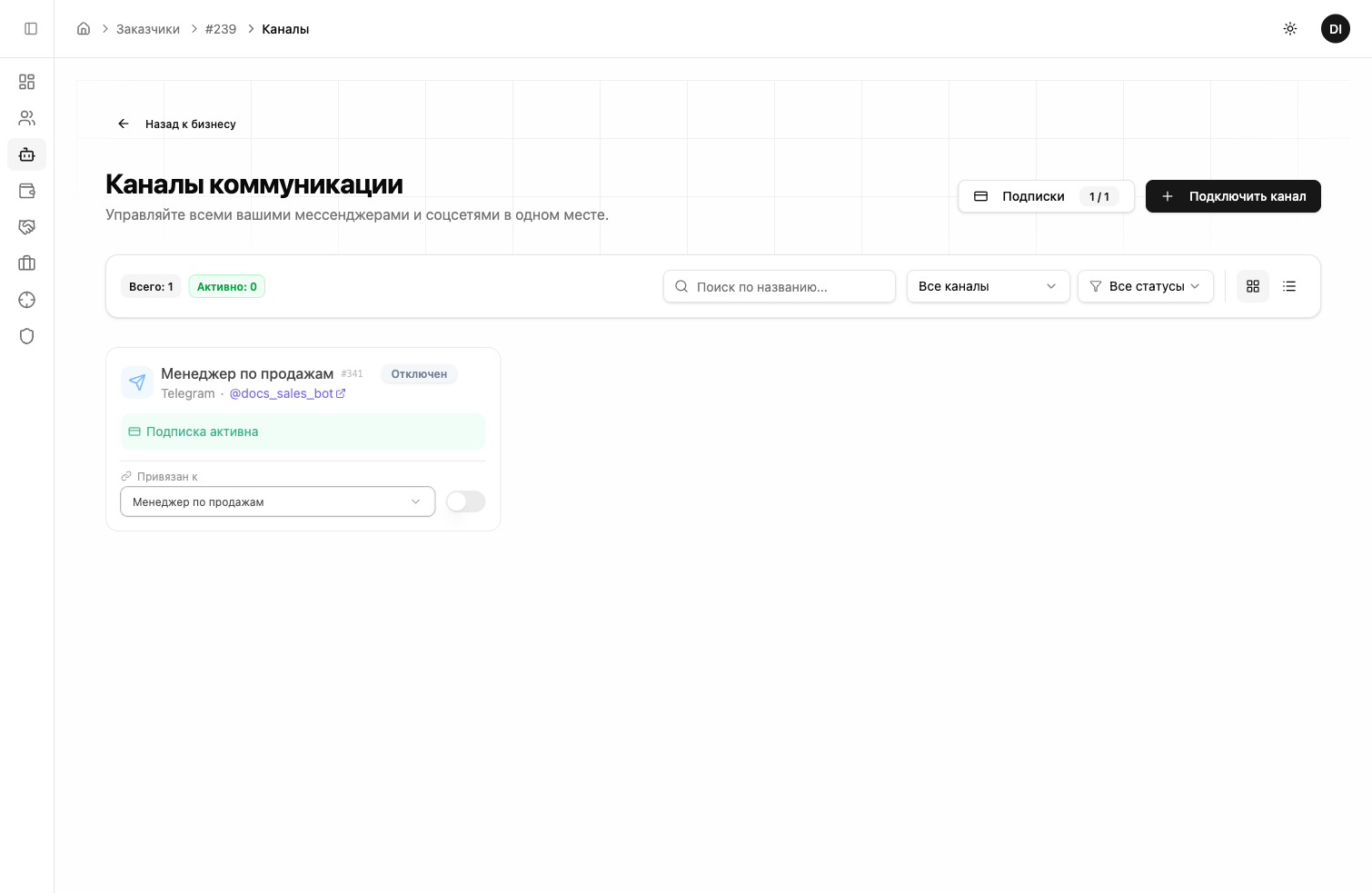 Перейдите в раздел «Боты и каналы» в боковом меню. Нажмите «Добавить».