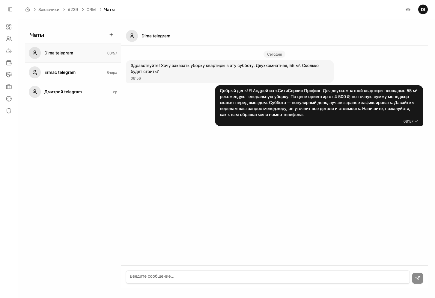 Все переписки также доступны в разделе «CRM» → «Чаты» — это полноценный мессенджер со списком диалогов слева и перепиской справа. Здесь удобно отвечать клиентам вручную, когда нужно подключиться к разговору: