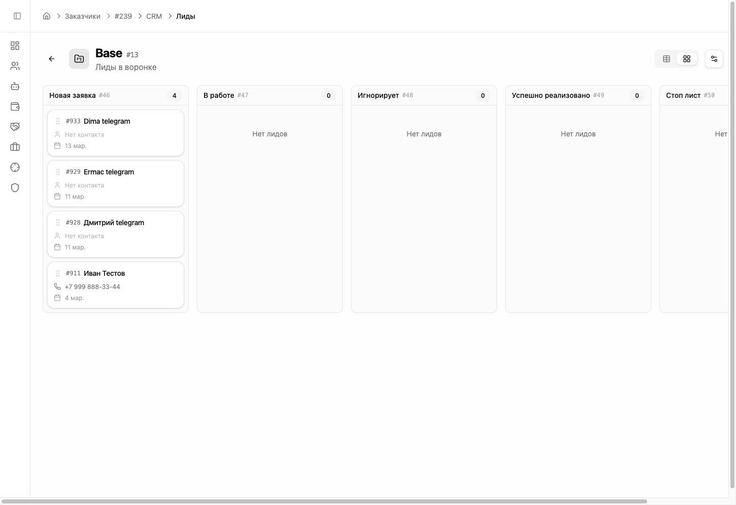 Все диалоги автоматически сохраняются в CRM. Откройте раздел «CRM» → «Лиды» в боковом меню, выберите воронку — и вы увидите всех клиентов на канбан-доске: