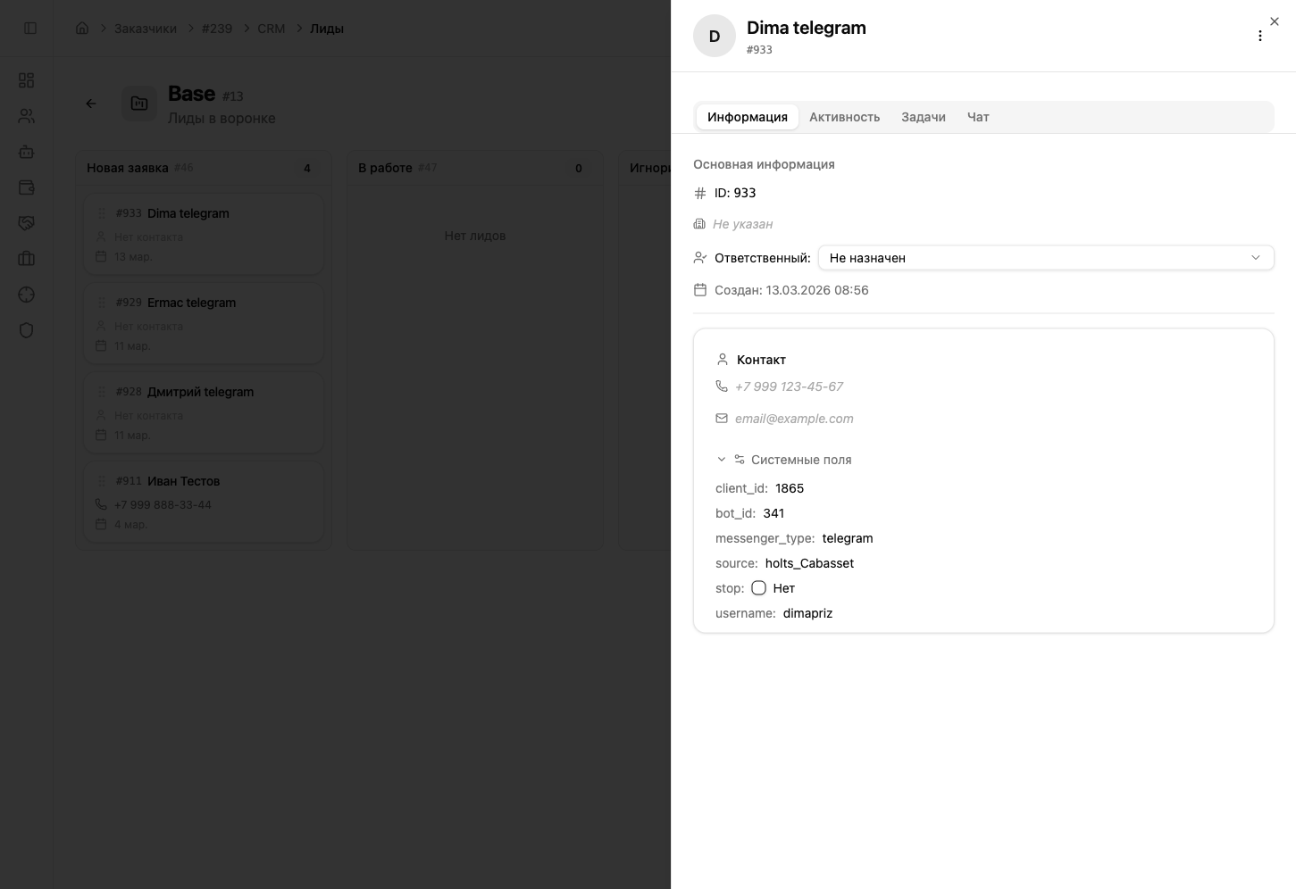 Нажмите на карточку лида — откроется боковая панель с вкладками Информация, Активность, Задачи и Чат.