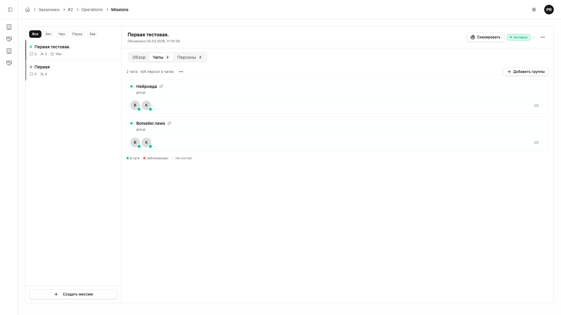На табе «Чаты» внутри миссии отображаются привязанные группы с матрицей членства персон.