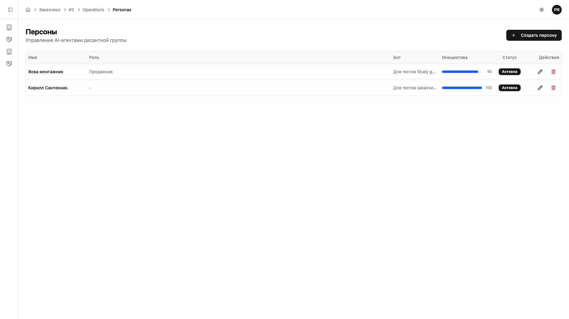 Все персоны отображаются в разделе «Рой Агентов» → «Персоны». Таблица показывает имя, роль, привязанный бот (Telegram-аккаунт), уровень инициативы и статус.