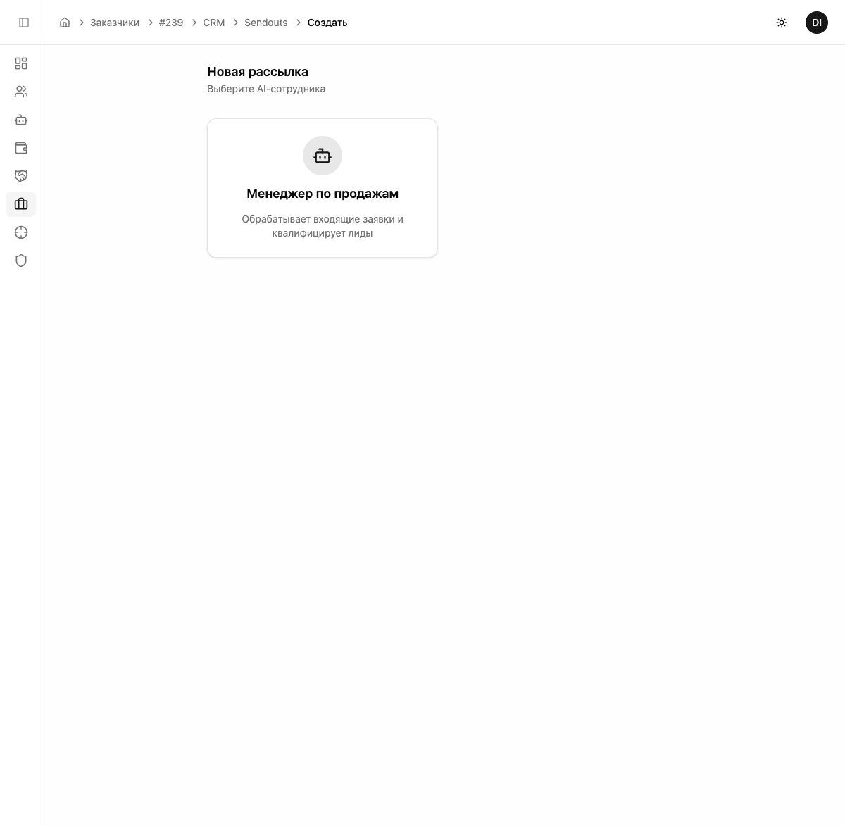 Система покажет карточки всех активных AI-сотрудников. Выберите того, кто будет обрабатывать ответы клиентов на рассылку.