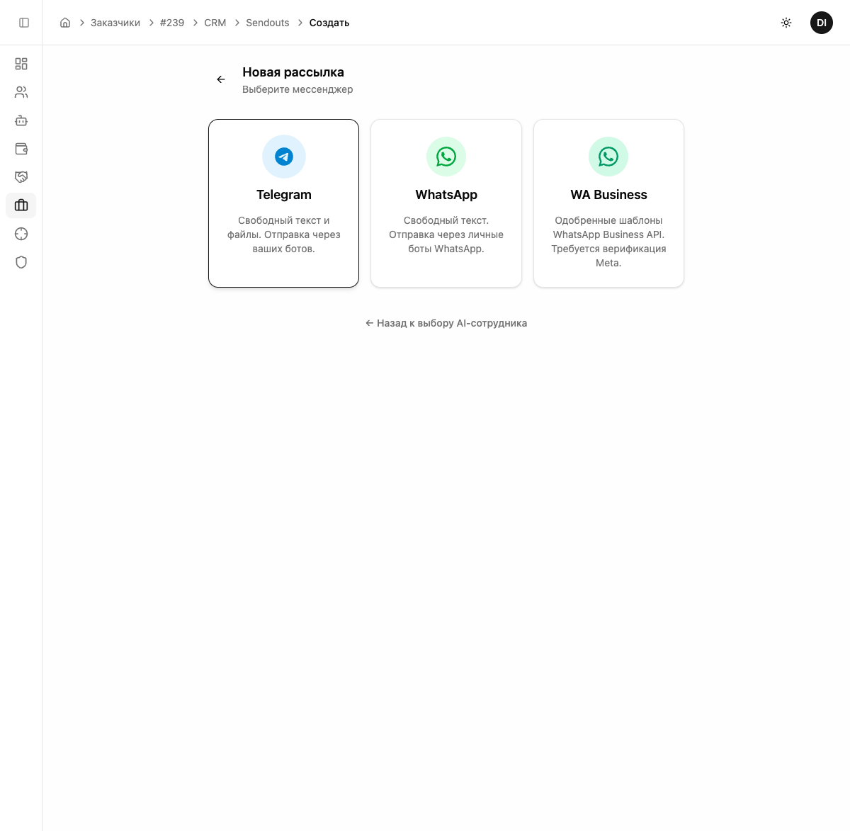 AI-сотрудник определяет, через каких ботов будет отправляться рассылка. Если к сотруднику привязано 3 Telegram-аккаунта — система распределит нагрузку между ними.