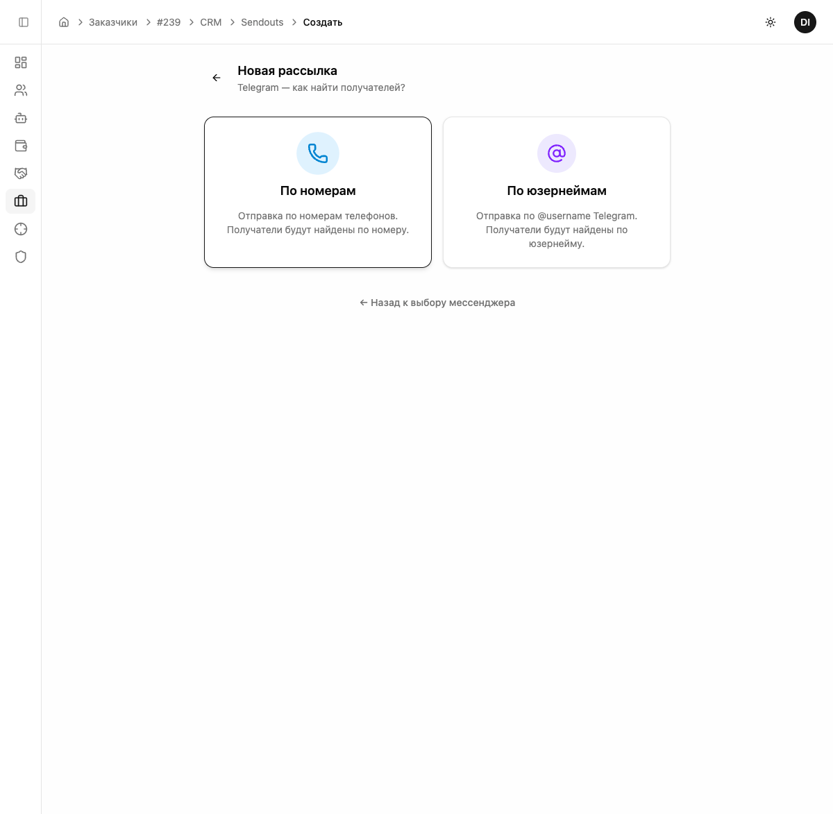 Выбор способа определяется на втором шаге мастера. В одной рассылке можно использовать только один способ — или номера, или юзернеймы.