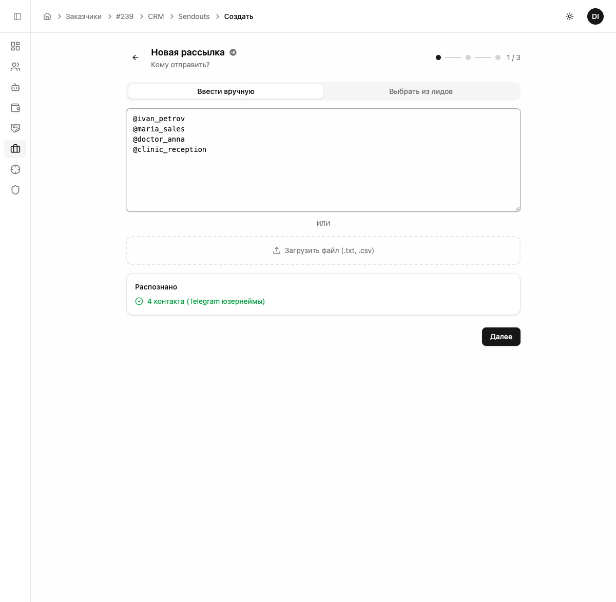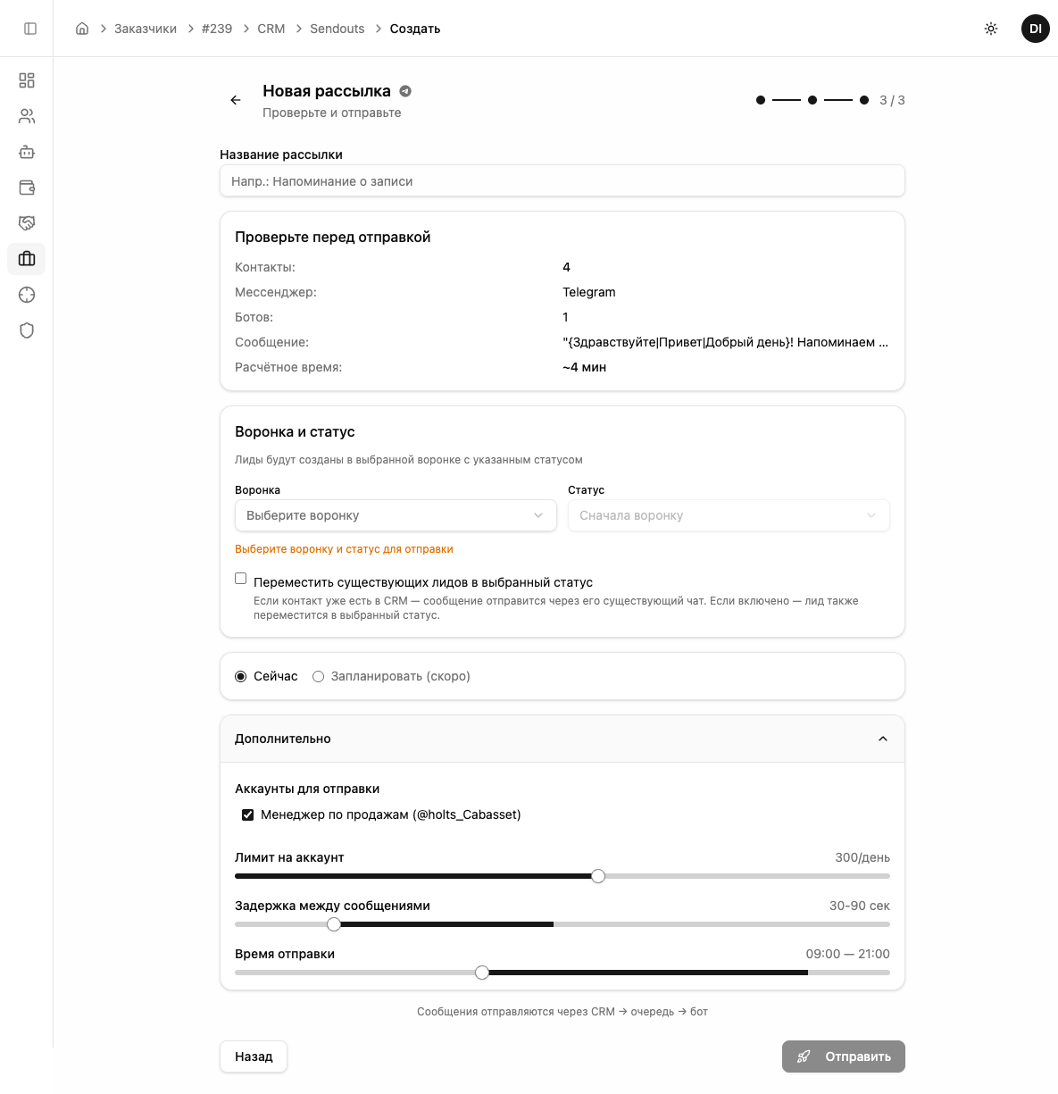 При выборе из CRM по умолчанию включена опция «Продолжить в существующих чатах» — сообщения отправятся через ботов, которые уже общались с лидами. Если отключить — система создаст новые чаты через случайных ботов.