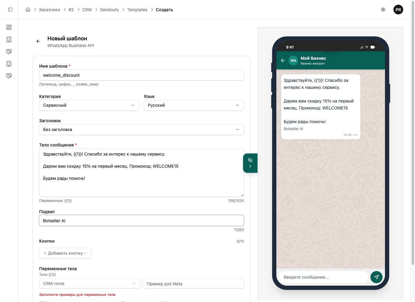 Переменные в заголовке и теле нумеруются отдельно. {{1}} в заголовке и {{1}} в теле — это разные переменные с разными CRM-полями. Каждая нумерация начинается с единицы. Внизу формы все переменные отображаются раздельно: «Заголовок {{1}}» и «Тело {{1}}».