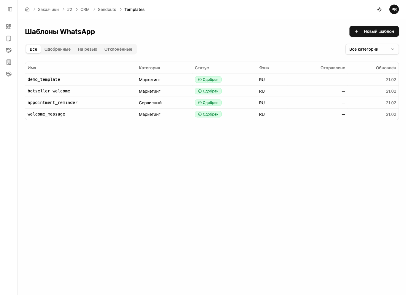В списке отображаются только одобренные шаблоны. Если клиент ответит на шаблон — откроется 24-часовое окно для свободного общения.