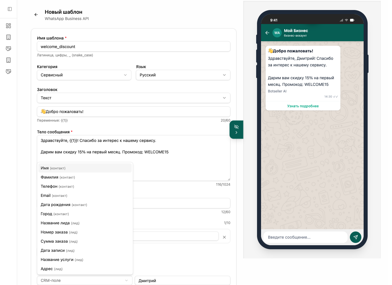 При рассылке система автоматически подставит данные из CRM. Если вы выбрали CRM-поле «Имя (контакт)», каждый клиент получит сообщение со своим именем. Можно использовать данные как из CRM-карточки лида, так и из контактов WhatsApp — например, чтобы обратиться по имени из профиля мессенджера.