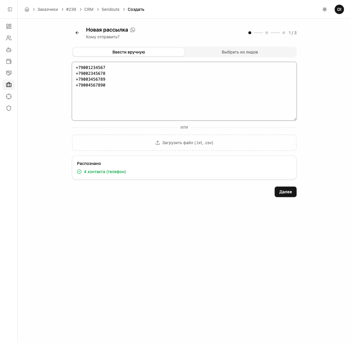 +380501234567Загрузить файл — .txt или .csv с номерами.